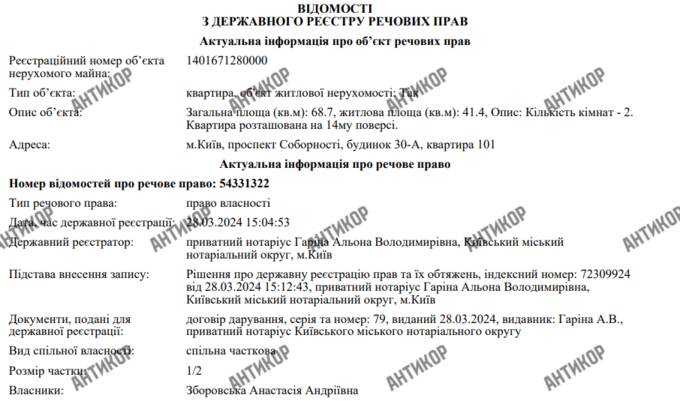І в тому ж місяці ймовірна колишня дружина Зборовського стала власницею двокімнатний квартири у новобудові в Києві. Помешкання було отримане нею за договором дарування.