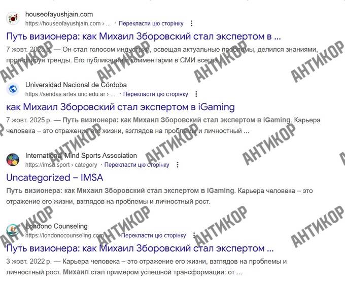 На зміну цим слідам приходять десятки англомовних публікацій, написаних за однією схемою. «Візіонер», «технологічний реформатор», «український підприємець нового покоління» — фрази повторюються слово в слово на різних сайтах з мінімальним трафіком. Це не журналістика, а ретельно вибудувана репутаційна кампанія: старі відомості видаляються, а на їх місце ставиться полірована легенда.